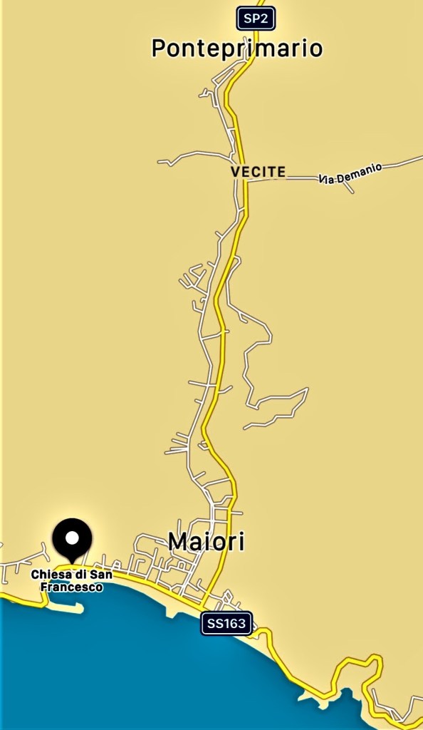 Lungo la strada che da Maiori porta a Minori, accanto alla Chiesa di San Francesco, di fronte al Porto Turistico, vi è un’edicola votiva contenente una Madonna con Bambino. Essa attrae il viandante.